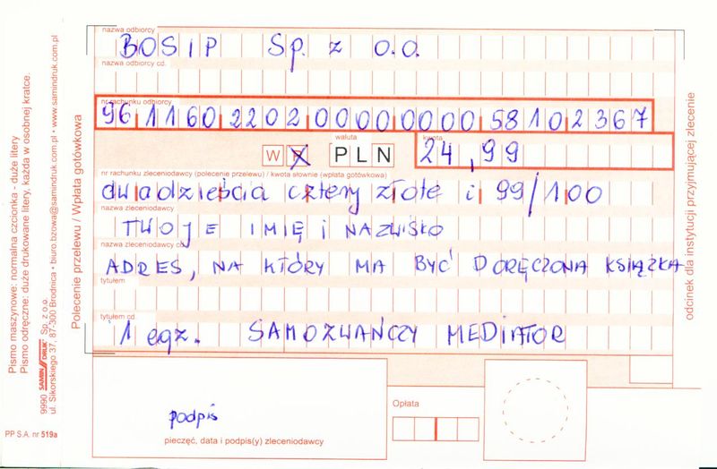 Wpłata kwoty 24,99 zł lub jej wielokrotności na rachunek bankowy: 96 1160 2202 0000 0000 5810 2367, nazwa odbiorcy: BOSIP Sp. z o.o. z podaniem adresu (i NIP-u) spowoduje odwrotne przesłanie książki/książek wraz z fakturą (koszty wysyłki krajowej pokrywa kupujący). Zobacz jak wypełnić druk wpłaty.