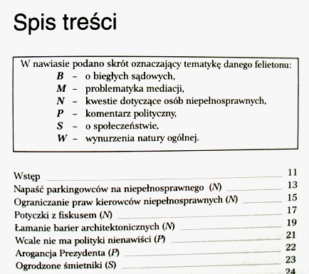 Nie lubię publicystyki - ale teksty umieszczone tutaj są krótkie i różnorodne, nie zdążyłam się żadnym znudzić. Nie rozumiem polityki, ale komentarze polityczne pisarza są wyjątkowo celnie wyartykułowane, na czasie i nawet mnie przekonują co do pewnych zagadnień. Problematyka mediacji wydawała mi się być nudnym tematem, ale nie w takim technicznym ujęciu, jakie zaprezentował autor. Kwestie osób niepełnosprawnych zawsze mnie poruszały i tutaj całkowicie popieram poglądy twórcy, nawet uważam, że za mało napiętnował tych, którzy nie zetknęli się z tymi sprawami. O biegłych sądowych, społeczeństwie i o innych wynurzeniach natury ogólnej mogę spokojnie powiedzieć, że artykuły są ciekawe, przemyślane i logiczne.